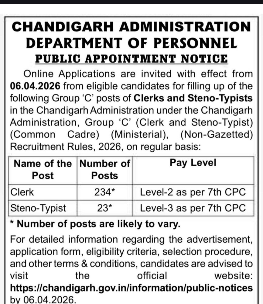 Chandigarh Govt Recruitment 2026 : Lok Career Latest Update के अनुसार, चंडीगढ़ प्रशासन के कार्मिक विभाग (Department of Personnel) ने ग्रुप ‘C’ के अंतर्गत Clerk और Steno-Typist के पदों पर सीधी भर्ती के लिए पब्लिक नोटिस जारी कर दिया है। यदि आप चंडीगढ़ जैसे खूबसूरत शहर में सरकारी नौकरी (Sarkari Naukri) का सपना देख रहे हैं, तो यह आपके लिए सबसे बड़ा मौका है।