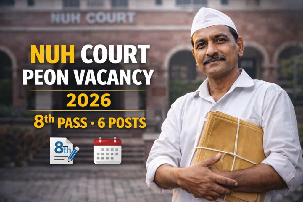 Nuh Court Peon Vacancy 2026 – Offline Form 8th Pass jobs In Haryana District and Sessions Judge, Nuh (Haryana) द्वारा Peon पदों पर भर्ती के लिए ऑफलाइन आवेदन आमंत्रित किए गए हैं। यह भर्ती Adhoc Basis पर की जाएगी। इच्छुक उम्मीदवार अंतिम तिथि से पहले ऑफलाइन फॉर्म जमा कर सकते हैं।